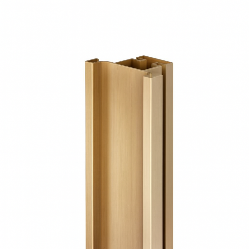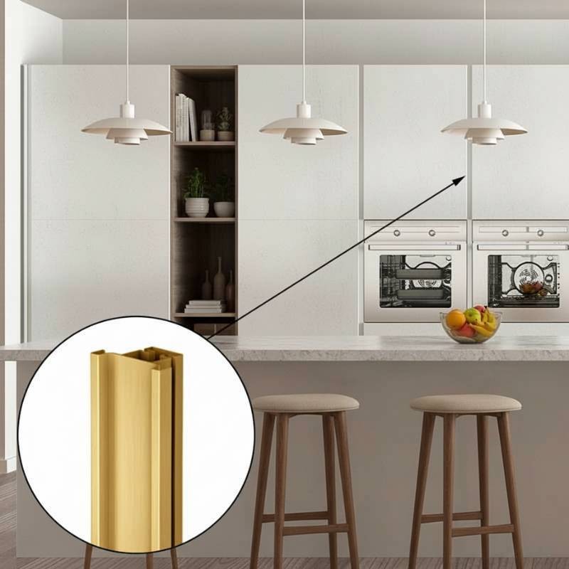 Perfil gola intermedio en acabado oro, diseñado para instalación vertical entre dos muebles contiguos con puertas que abren en direcciones opuestas. Permite una apertura práctica desde cualquiera de los cantos. Su acabado en oro añade distinción, elegancia y un estilo exclusivo a cualquier proyecto de cocina o decoración.